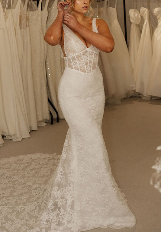V-Neck Straps Lace Appliques Bodycon Mermaid Wedding Dress