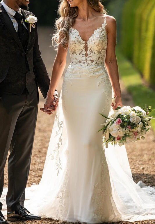V-Neck Straps Lace Appliques Sleek Mermaid Wedding Dress