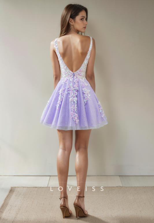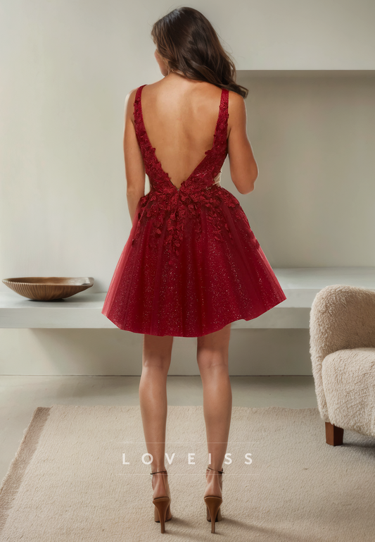 A Line V Neck Tulle Appliques Cute Homecoming Dress Open Back Short Prom Graduation Dress