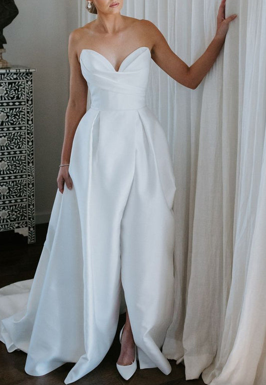 V-Neck Strapless Side Slit Sleek Satin A-Line Wedding Dress