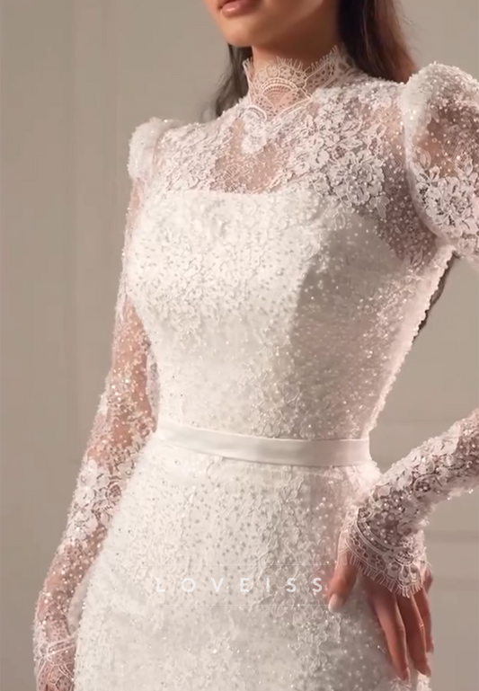 High Neck Long Sleeves Lace Appliques Mermaid Wedding Dress