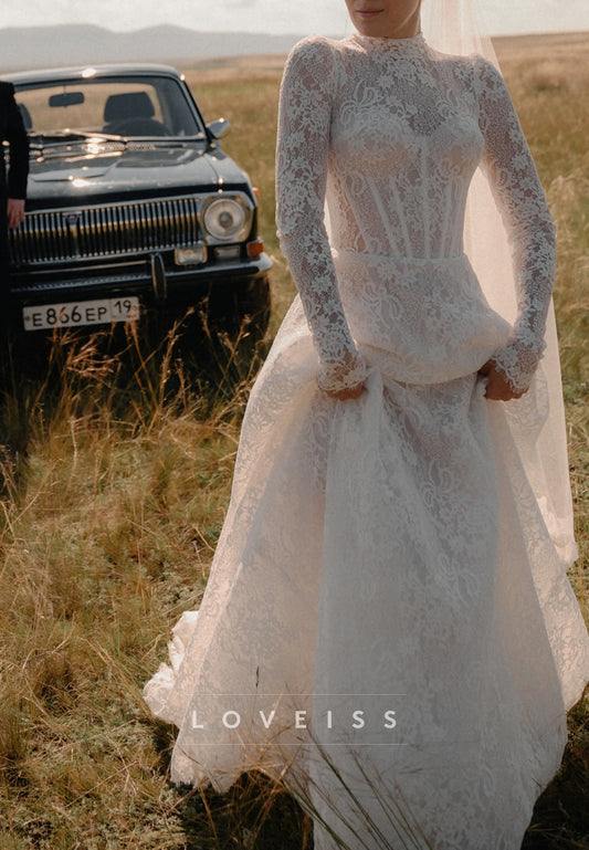 High Neck Long Sleeves Lace Appliques A-Line Wedding Dress