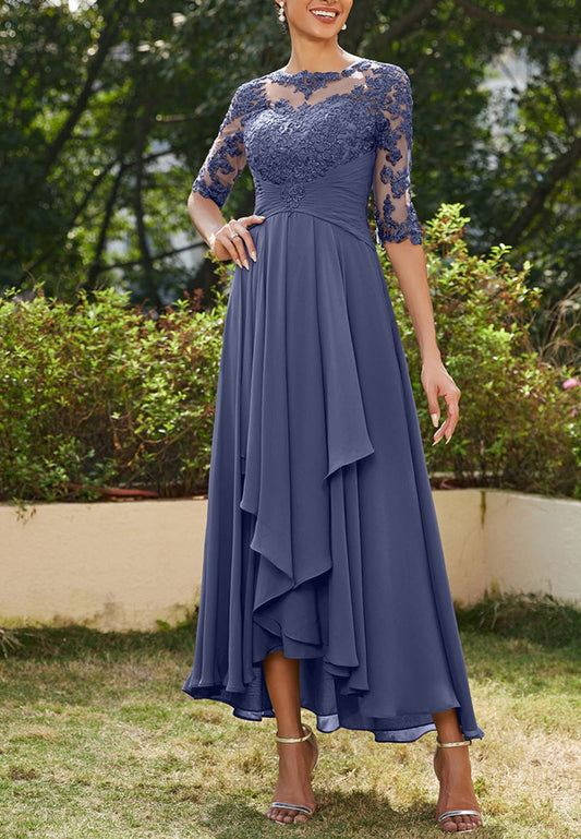 Scoop Half Sleeves Appliques Ruffled Chiffon Mother of Bride Dress Cocktail Dress