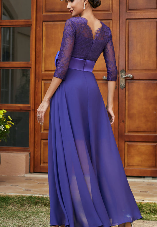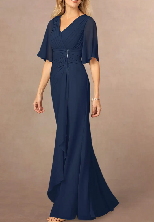 V-Neck Short Sleeves Chiffon Sheath Long Mother of Bride Dress