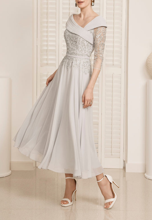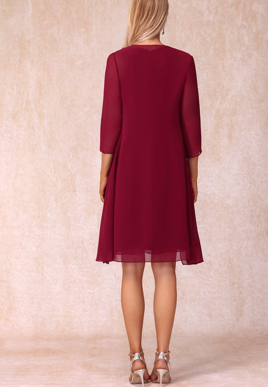 V-Neck 34 Length Sleeves Chiffon Pleated A-Line Mother of Bride Dress Cocktail Dress