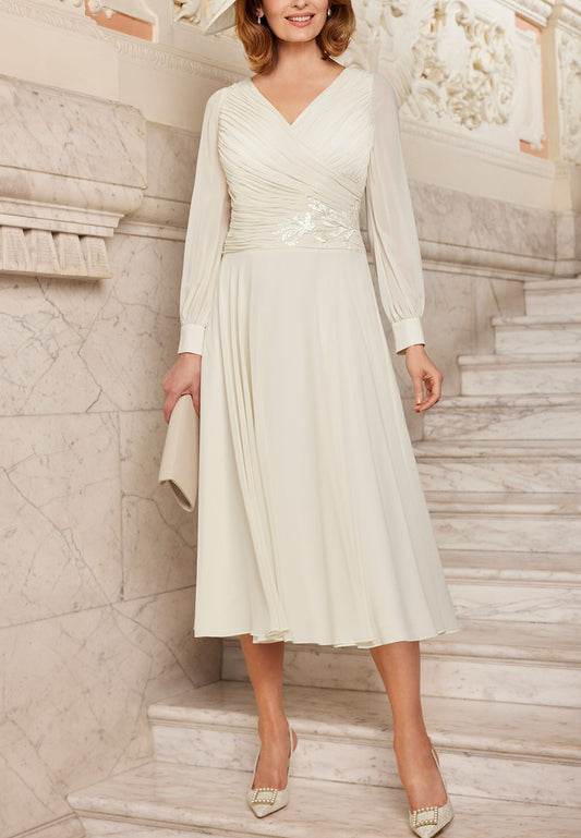 V-Neck Long Sleeves Chiffon Pleated A-Line Mother of Bride Dress Cocktail Dress