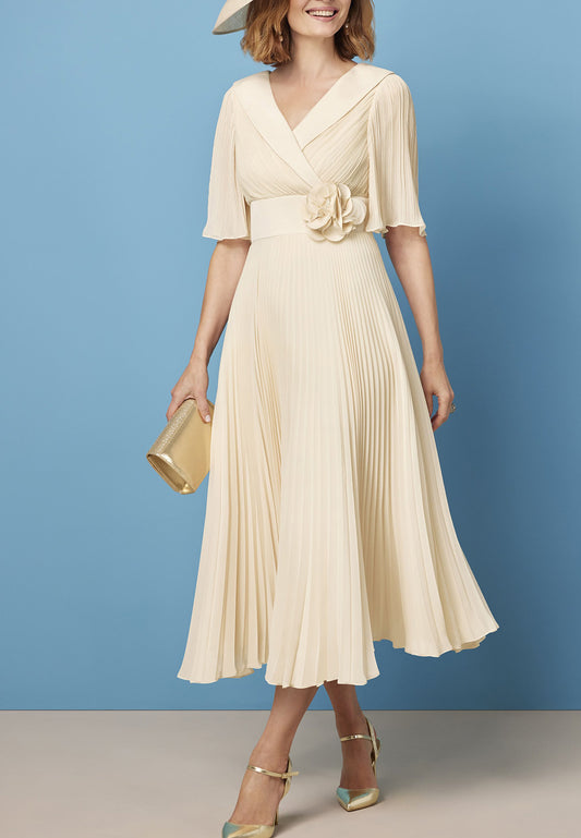 V-Neck Half Sleeves Pleated Floral A-Line Mother of Bride Dress Cocktail Dress