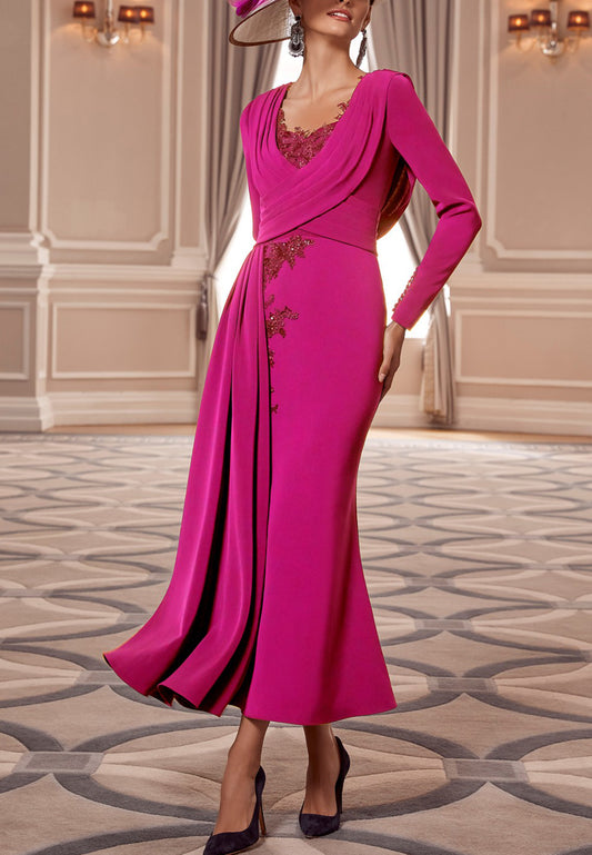 V-Neck Long Sleeves Appliques Sleek Mermaid Mother of Bride Dress
