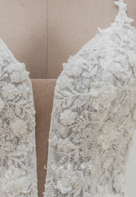 V-Neck Spaghetti Straps Floral Embellished Mermaid Wedding Dress