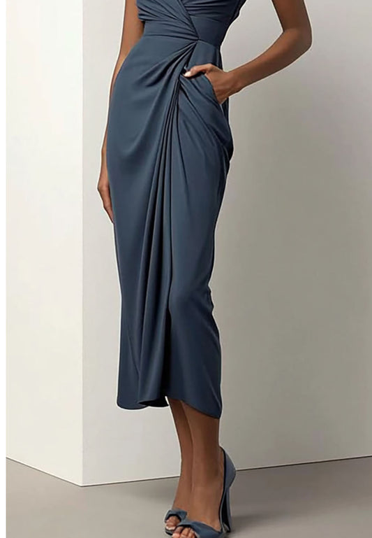 Work Business Dark Blue Dress Sleeveless Pencil V-Neck Sheath Midi Dres