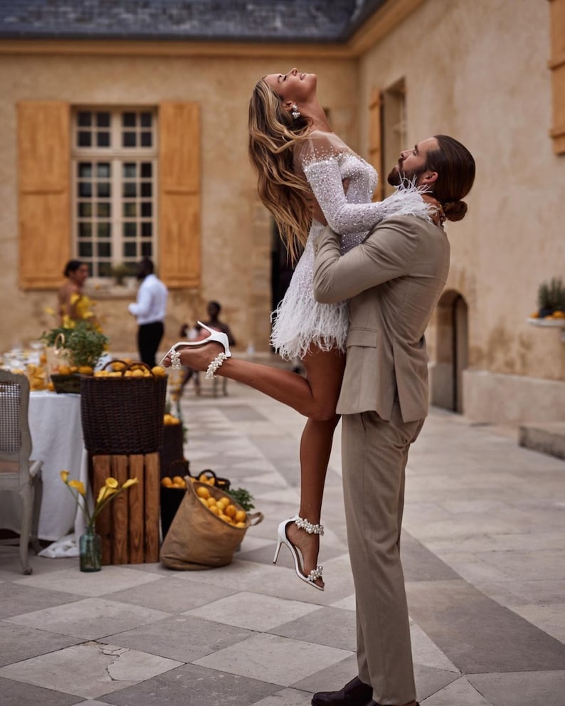 Beaded and sparkly feather mini dress. Custom short wedding dress, tailored to bride's measurements.