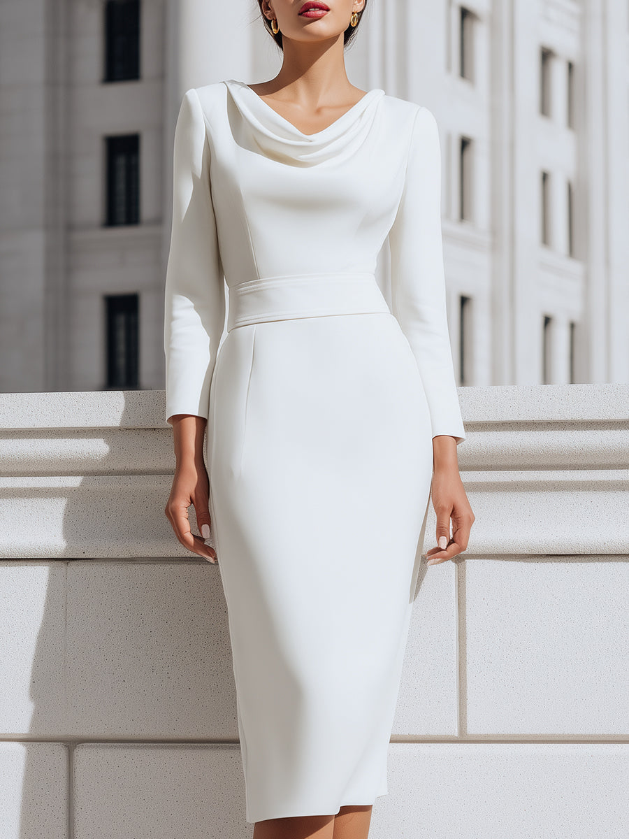 The Elegant White Draped Neck Midi Dress is a refined statement piece designed for women who value timeless sophistication. Crafted in a pristine white hue, this dress features a graceful draped neckline that softens the structured silhouette while exuding understated femininity.