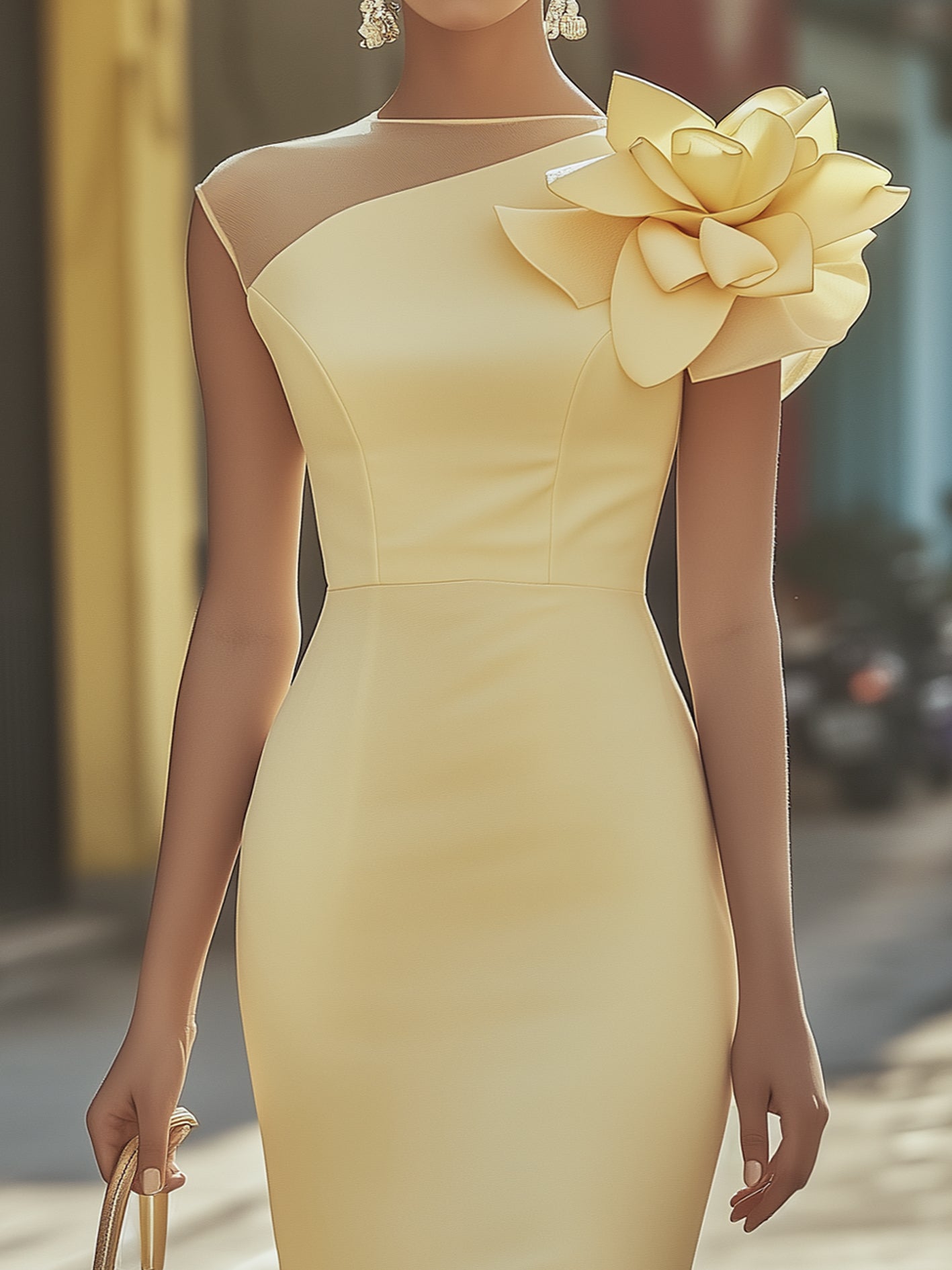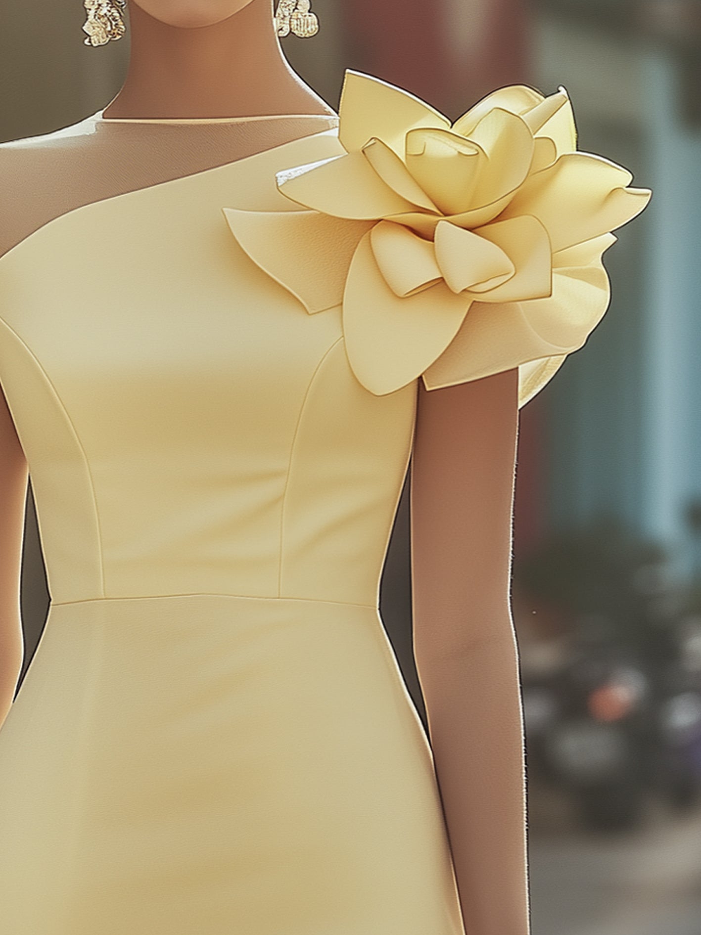 Loveiss presents a radiant statement in sculptural elegance with the Soleil Bloom One-Shoulder Pencil Dress. This lemon-yellow creation balances architectural precision with romantic detailing—featuring a structured silhouette, sheer mesh neckline, and an oversized 3D floral appliqué blooming from the shoulder. The minimalist bodycon form contrasts beautifully with the dimensional flower, striking a modern harmony between sleek and soft.