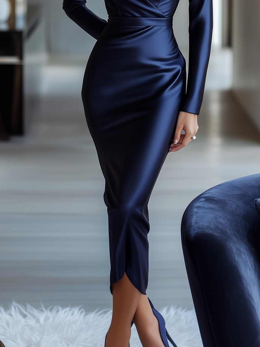 Navy Satin Bodycon Dress with Classic V-Neck and Chic Design