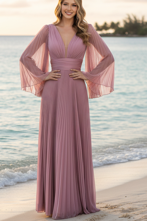 V-Neck Long Bell-Sleeve Pleated Long Formal Dress