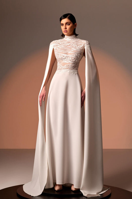 Extravagant Long Ruffled Sleeves Feather decorated Mock-neck High neck Side slit skirt Floor length no train A-line wedding dress
