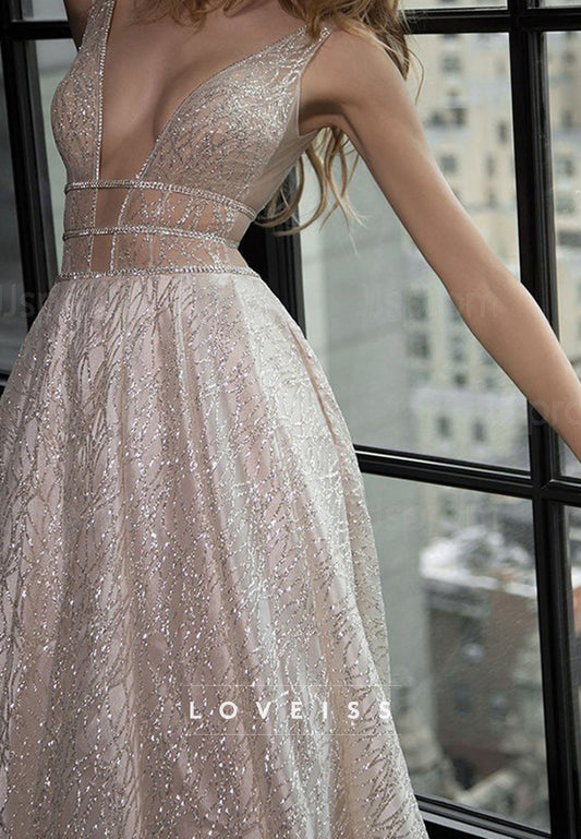 Low V-Neck Beaded Embroidery Sparkly A-Line Evening Dress