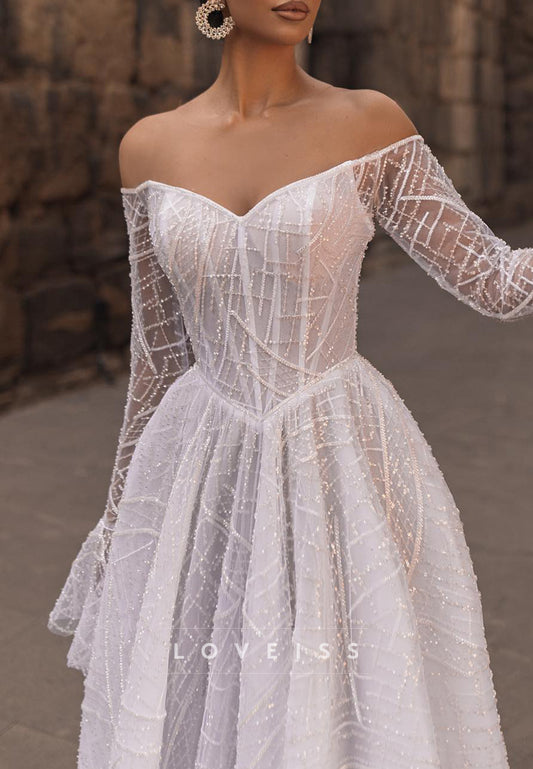 Off-Shoulder Long Sleeves Beaded Embroidery A-Line Wedding Dress
