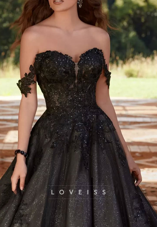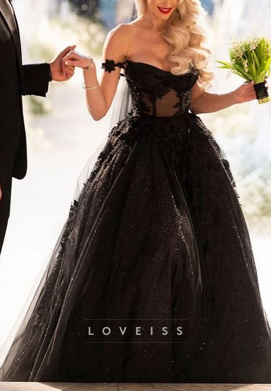 Off-Shoulder Sparkly Appliques Ball Gown Black Wedding Dress