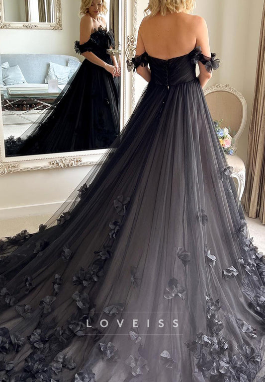 Off-Shoulder Tulle Floral Embellished A-Line Black Wedding Dress