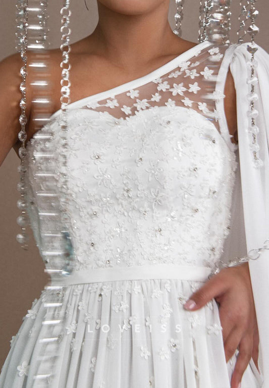 One Shoulder Long Sleeves Appliques Chiffon A-Line Wedding Dress