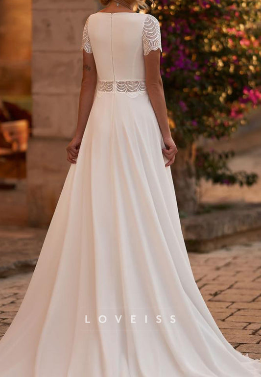Square Short Sleeves Sleek A-Line Boho Wedding Dress