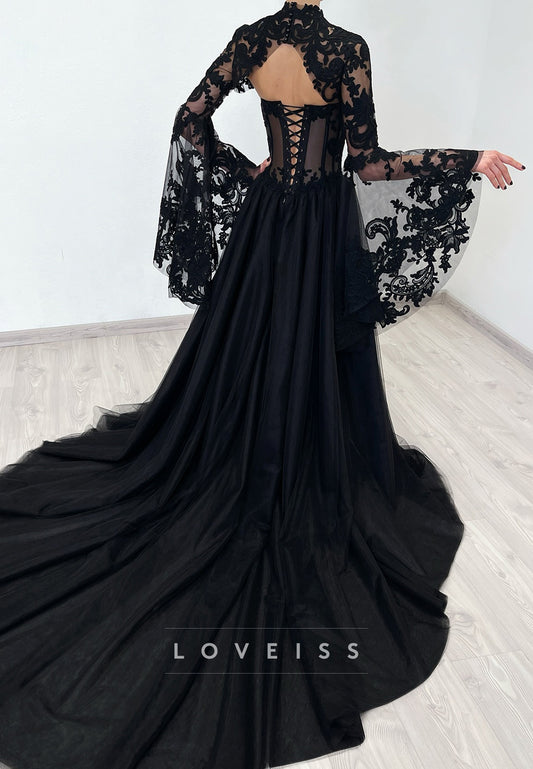 High Neck Long Sleeves Lace Appliques A-Line Wedding Dress