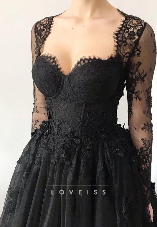Sweetheart Long Sleeves Lace Appliques A-Line Black Wedding Dress