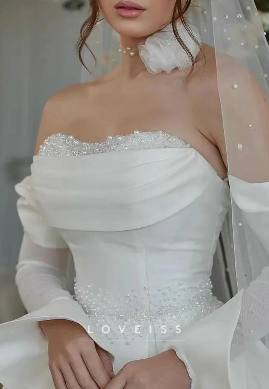 Sweetheart Long Sleeves Pearl A-Line Satin Wedding Dress