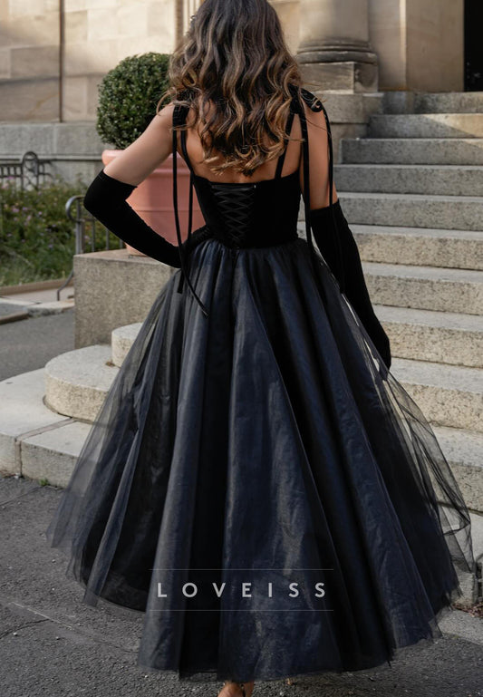 Sweetheart Spaghetti Straps Tulle A-Line Black Midi Wedding Dress