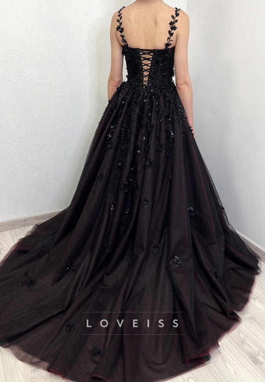 Sweetheart Straps Appliques Sparkly A-Line Black Wedding Dress