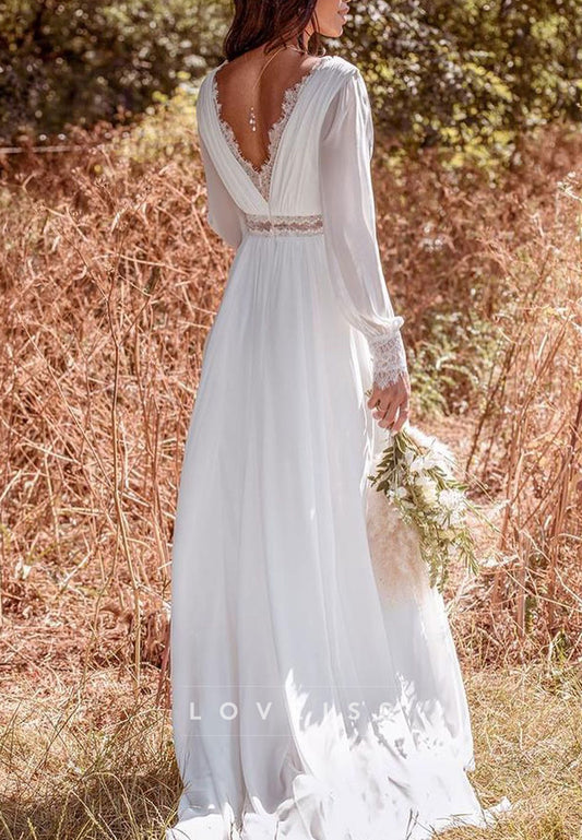 V-Neck Long Sleeves Empire Waist A-Line Boho Wedding Dress