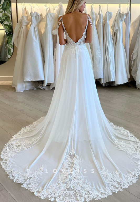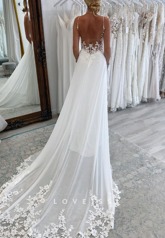 V-Neck Spaghetti Straps Chiffon A-Line Appliques Wedding Dress
