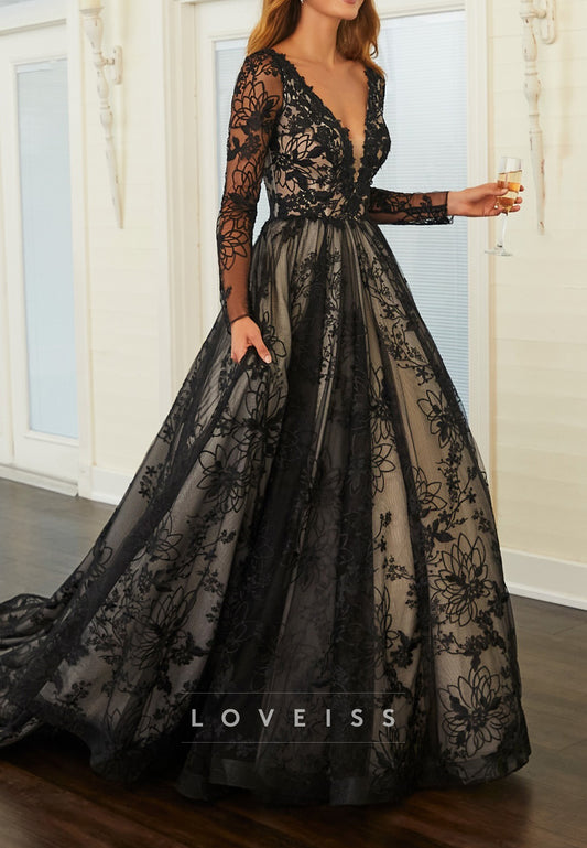 V-Neck Long Sleeves Lace Appliques A-Line Black Wedding Dress