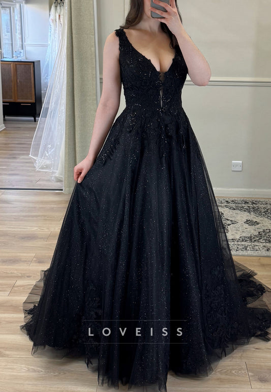 V-Neck Long Sleeves Appliques Sparkly A-Line Black Wedding Dress