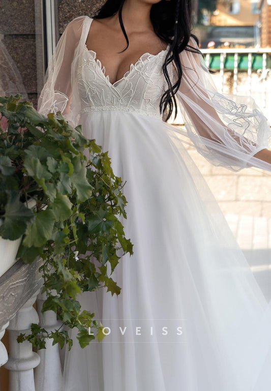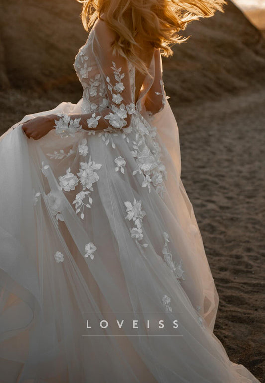 V-Neck Long Sleeves Appliques Tulle A-Line Wedding Dress