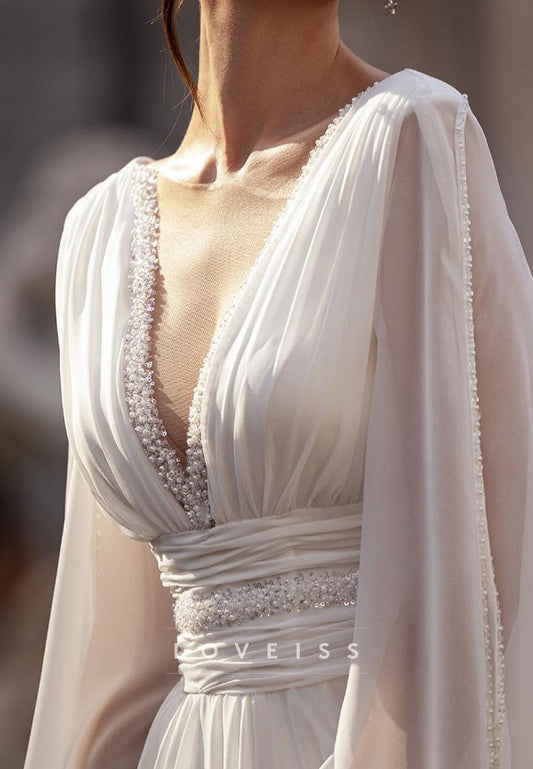 V-Neck Long Sleeves Pleated Chiffon A-Line Beach Wedding Dress