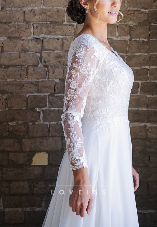 V-Neck Long Sleeves Lace Appliques Chiffon A-Line Wedding Dress