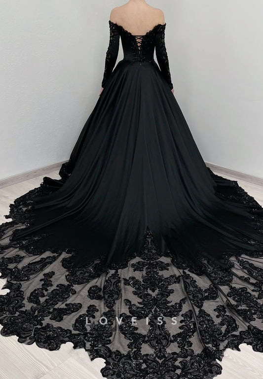 Off-Shoulder Sequins Appliques A-Line Black Wedding Dress