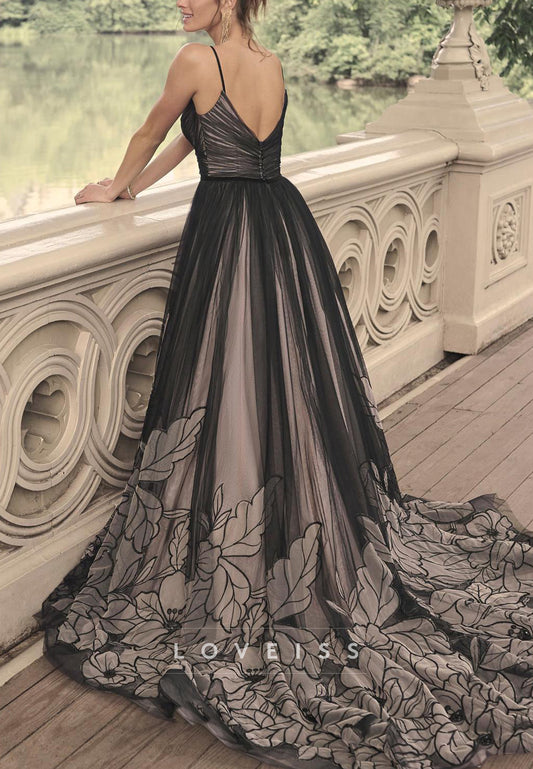 V-Neck Pleated Spaghetti Straps Appliques A-Line Wedding Dress