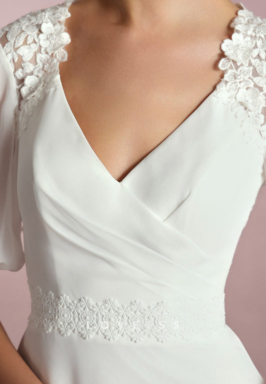 V-Neck Short Sleeves Appliques Sleek A-Line Wedding Dress