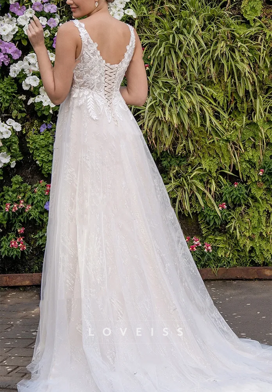 V-Neck Appliques Side Slit A-Line Beach Wedding Dress