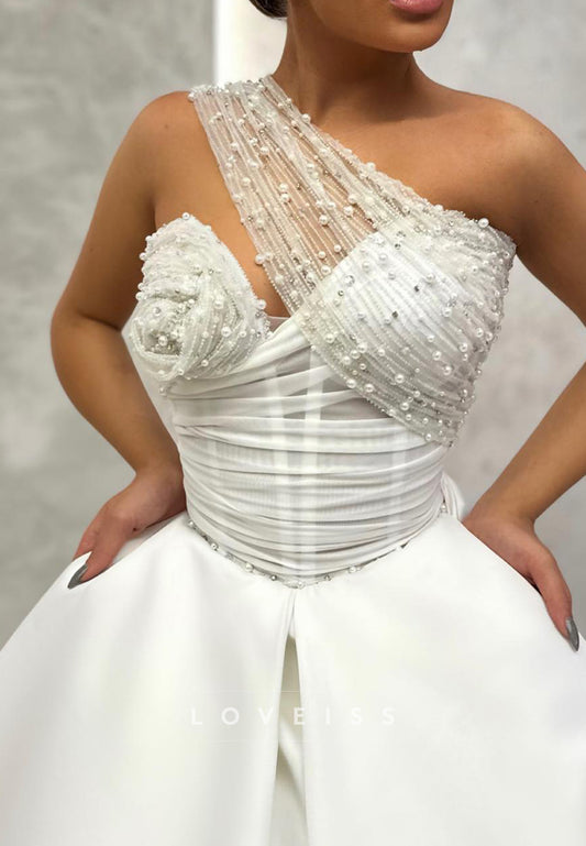 Asymmetrical Sleeveless Beaded Floral A-Line Satin Wedding Dress