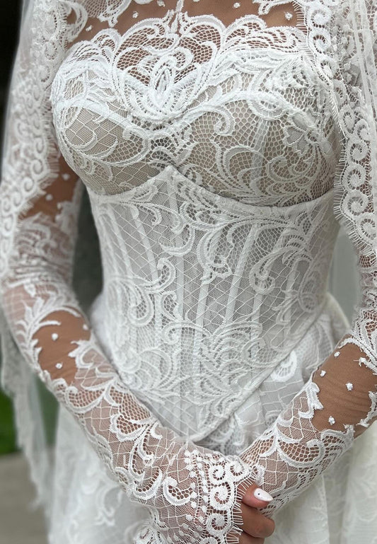 High Neck Long Sleeves Lace Appliques A-Line Wedding Dress