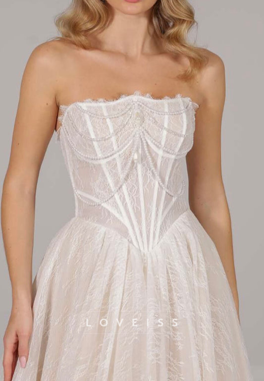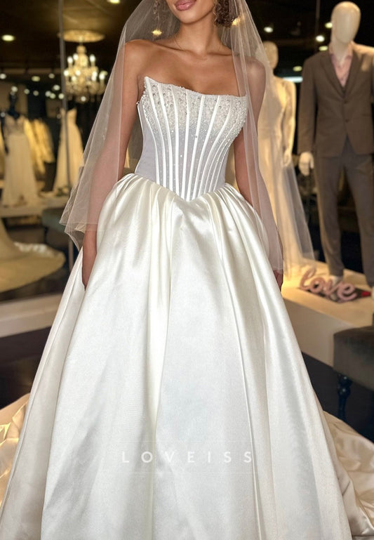 Straight Across Lace Appliques Pearl A-Line Wedding Dress