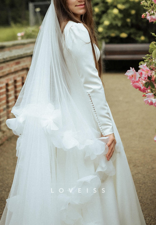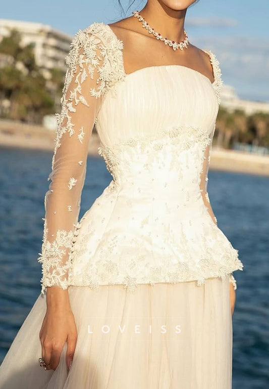Square Long Sleeves Lace Appliques A-Line Wedding Dress