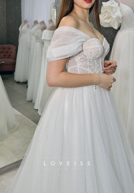 Off-Shoulder Sleeveless Beaded Corset A-Line Wedding Dress
