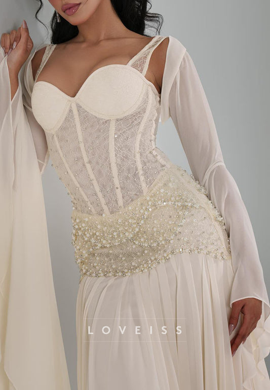 Sweetheart Long Sleeves Beaded Chiffon A-Line Evening Dress