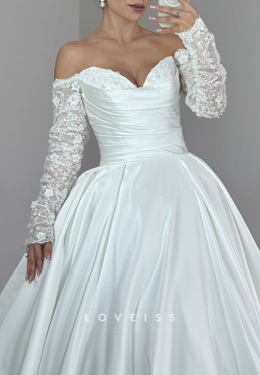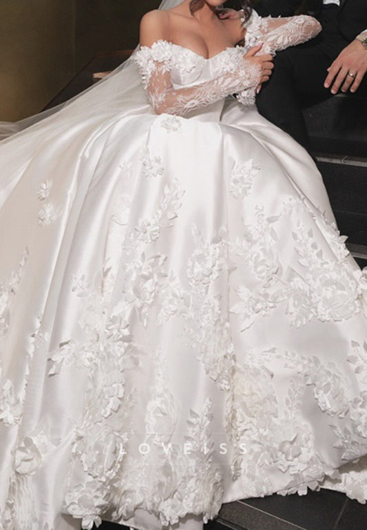 Sweetheart Long Sleeves Floral Appliques A-Line Satin Wedding Dress