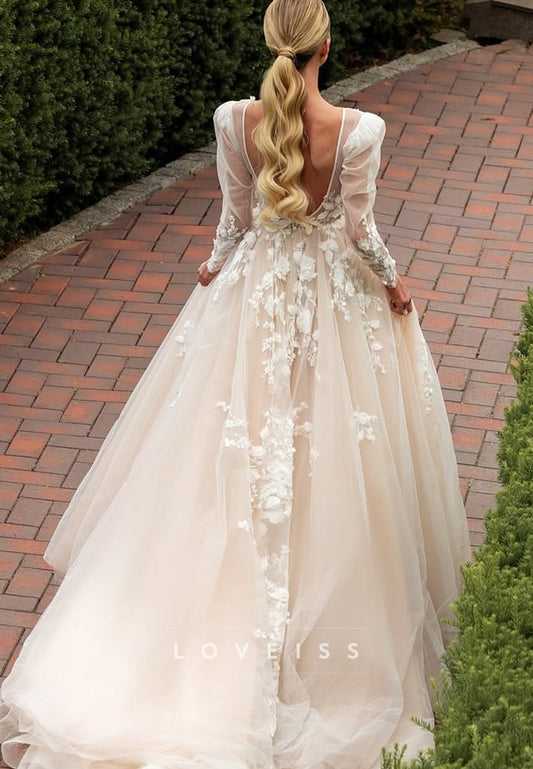 V-Neck Long Sleeves Floral Appliques A-Line Wedding Dress
